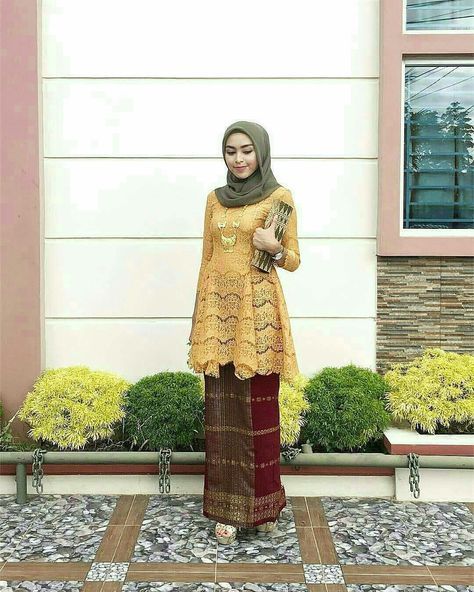 Gamis gaun pesta brokat kombinasi batik modern merah maroon. Kebaya brokat bentuk peplum warna rose dengan pita melingkar yang berpadu rok batik maroon hitam dan hijab square. Kombinasi warna indigo dan putih. Kombinasi warna emas dan merah. Jika kamu penyuka gaya klasik.